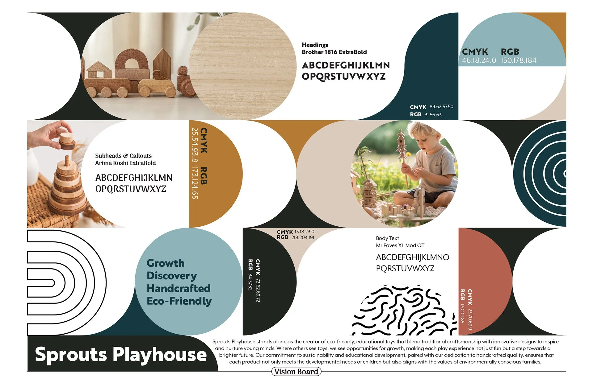 Sprouts Playhouse is a full brand identity built for an educational toy company with a sustainability focus. The strategy centered on merging play with environmental responsibility to appeal to eco-conscious parents and grandparents. Research shaped every decision — from a soft, nature-inspired palette to inclusive imagery and Bauhaus-influenced typography paired with hand-drawn details to balance trust with playfulness.